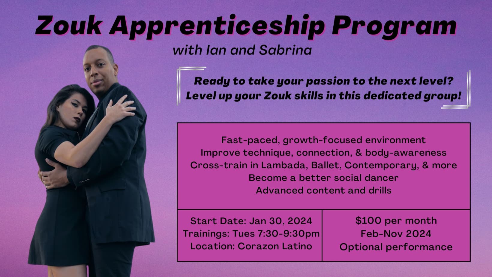 Tuesdays 7:30-9:30pmReady to take your passion for Zouk to the next level??Join this intensive training group to quickly grow as a social dancer! We'll train advanced concepts and drills to improve technique, strength, connection, body-awareness, balance, and more! Be prepared to cross-train, dissect the details, and take a focused approach to Zouk. This program is great for Zouk dancers who are excited to work hard to improve and become better dancers in 2024!To join, you must have a solid understanding of Zouk fundamentals as we will be working on harder concepts! You must commit to the entire program from February - November 2024! Text Sabrina if you have any questions or concerns! Trainings will be every Tuesday 7:30-9:30pm at Corazon Latino Dance Studio